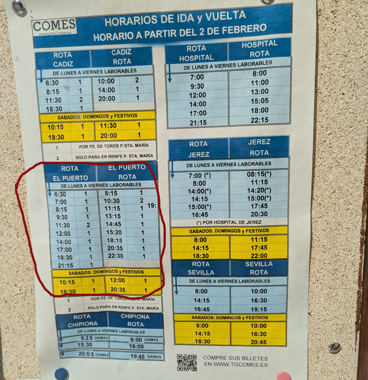 - To Rota. One of the most beautiful beach towns we’ve seen in Spain, we loved Rota. Getting there by public transport was a bit trickier. Buses M-062, M-061, M-060 do the route from El Puerto’s Plaza de Toros. Cost 2.10 Euros, takes about 35 minutes. I took a photo of the schedule here.